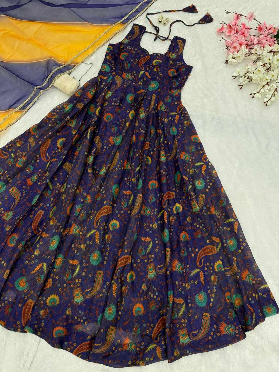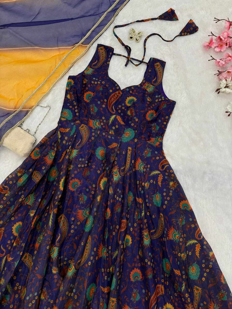Anarkali Gown – Digital printed Jimmy Organza Silk Anarkali suit with a huge flair, creating a graceful and flowy silhouette